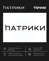 Флагманский проект группы компаний Точно - жилой комплекс бизнес-класса Патрики, это 10 домов разной этажности расположившихся на 28,5 гектарах. Жилой комплекс с концепцией город в город - прогулочные аллеи, парковая территория, 3 детских сада, 2 школы - одна из которых частная, Гранд аллея с ресторанами, фонтанами и модными бутиками, уникальные мафы и ландшафтный дизайн, создают особую атмосферу - место в котором хочется находиться. В Патриках предусмотрен и креативный кластер Цех, который включает в себя пространство для коворкинга, фудкорт, бутики, детский комплекс, лектории, фитнес-клуб Баланс с волной для сёрфа. Но и это еще не все ГК Точно уважает историю, поэтому мы сохранили 2 башни - наследство от завода "Сельмаш" исторический арт-объект назвали Мастер и Маргарита.