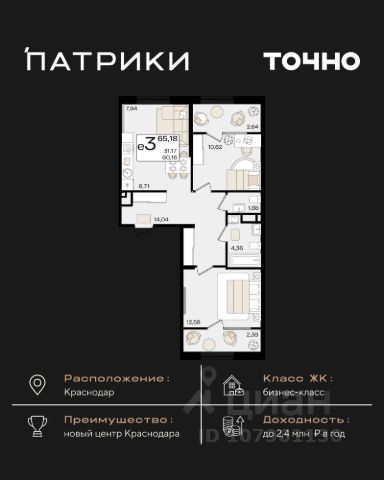Флагманский проект группы компаний Точно - жилой комплекс бизнес-класса Патрики, это 10 домов разной этажности расположившихся на 28,5 гектарах. Жилой комплекс с концепцией город в город - прогулочные аллеи, парковая территория, 3 детских сада, 2 школы - одна из которых частная, Гранд аллея с ресторанами, фонтанами и модными бутиками, уникальные мафы и ландшафтный дизайн, создают особую атмосферу - место в котором хочется находиться. В Патриках предусмотрен и креативный кластер Цех, который включает в себя пространство для коворкинга, фудкорт, бутики, детский комплекс, лектории, фитнес-клуб Баланс с волной для сёрфа. Но и это еще не все ГК Точно уважает историю, поэтому мы сохранили 2 башни - наследство от завода "Сельмаш" исторический арт-объект назвали Мастер и Маргарита.