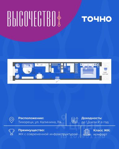 Квартира находится в перспективном, развивающемся районе Тихорецка - теплого южного города. Вокруг очень много зелени и чистый воздух. В шаговой доступности от ЖК Тихорецк - 3 школы, 2 детских сада, магазины Магнит и Пятерочка, пункты выдачи интернет-заказов. Недалеко от дома - парк и зелёная роща. Совсем рядом расположился Ледовый Дворец - гордость Тихорецка. Все, что нужно для комфортного проживания, находится в 5 минутах от дома! До центра города можно добраться на машине или общественном транспорте за 10 минут. Кстати, остановки общественного транспорта тоже находятся в шаговой доступности.