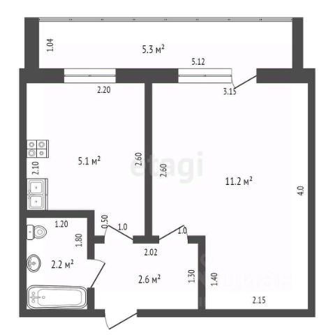 В этой квартире кухня-гостиная имеет площадь 19,4 м2 а спальная комната 12.4 м2