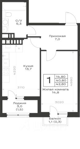 Окна в квартире и на балконе REHAU, с хорошей шумоизоляцией. Полы в комнатах и на балконе - ламинат, в кухне, прихожей и санузле - плитка. Потолки натяжные.