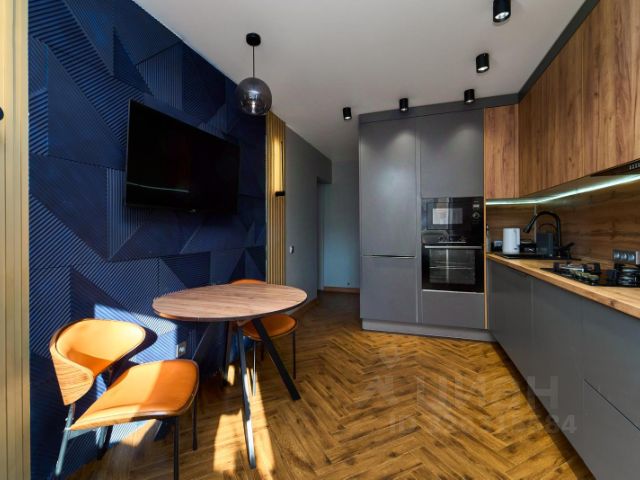 Кухня. Угловая кухня выполнена под заказ, фасады шкафов AGT, посудомоечная машина, встроенный холодильник, варочная поверхность, духовой шкаф, вытяжка. Установлены сплит-системы Kentatsu. Есть место под телевизор в каждой жилой комнате.
