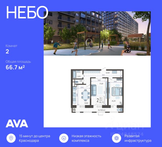 Жилой комплекс полностью сдан! В спокойном тихом районе Краснодара, утопающем в зелени, продается 2-комнатная квартира площадью 66.7 кв. м. Квартира расположена на 9 этаже, в жилом комплексе комфорт-класса "Небо". Девелопер проекта - компания AVA. "Небо" - идеальное место для жизни между небом и землей. Рядом парк, развитая инфраструктура, школы, детские сады, медицинские учреждения. Этот жилой комплекс - мечта для людей со спокойным ритмом жизни, ценящих уют и тишину почти в центре южной столицы. Транспортная доступность и окружение • 7 остановок общественного транспорта в шаговой доступности; • ПКиО имени 300-летия полиции России в 5 минутах пешком; • Парк "Патриот" с фонтаном в 10 минутах пешком; • Рядом улица Дзержинского - одна из основных магистралей Краснодара; • Удобный и быстрый выезд в центр города. Особенности архитектуры Жилой комплекс "Небо" - это 8 уютных 12-этажных домов с монолитным фундаментом. Фасад выдержан в бежевых и светло-коричневых тонах, легкости архитектуре придают лоджии с панорамным остеклением и "французские" окна. Достаточно большое расстояние между домами обеспечивает удобство перемещения во дворе и красивые виды из окон каждой квартиры. "Небо" - идеальный баланс комфорта и функциональности. Благоустройство территории Живописные дворы жилого комплекса "Небо" утопают в зелени - это идеальное место, где родители могут отдохнуть в тишине, пока их дети резвятся на ярких качелях и горках. Для маленьких жителей, подростков и спортсменов здесь расположены уникальные игровые зоны: площадки с развивающими малыми формами для игр, уютные качели-гнезда, веревочные комплексы, уличные тренажеры и многое другое. Входные группы Яркие небесные акценты в оформлении входных групп подчеркивают общую стилистику жилого комплекса. В каждом подъезде предусмотрены колясочные, дизайнерские лифты и круглосуточное видеонаблюдение. Другие преимущества: • Закрытая территория • Своя коммерция на первых этажах; • 2 подземных паркинга на территории ЖК; • Наземный 9-этажный паркинг; • Торговый центр, супермаркет и ВУЗ в шаговой доступности.