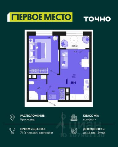 Жилой район "Первое место"- один из самых масштабных проектов в России. На территории 71 га 18 кварталов, 31 дом переменной этажности от 8 до 18 этажей, собственный парк 9 га, храмовый комплекс, пешеходный бульвар "Круг семьи", детские и спортивные площадки, мангальные зоны и различные локации для отдыха. В шаговой доступности действующие муниципальные образовательные учреждения: школа на 1 100 мест и детский сад на 250 мест. Помимо этого, в жилом районе "Первое место" построятся школа на 1700 мест с крытым 25-метровым бассейном и 5 детских садов на 1 490 мест. На первых этажах многоуровневых парковок "паркхабов" разместится более 61 тыс м2 коммерческих помещений. Жителям будут доступны собственный фитнес-центр, кафе, рестораны и магазины. В каждом подъезде предусмотрены дизайнерские холлы в стиле лобби отелей, консьерж-сервис, лапомойки, отдельные колясочные и велосипедные. Также в домах будут просторные кладовые помещения и комнаты для хранения почты с почтоматами для получения посылок из маркетплейсов.