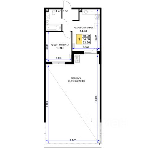 Общая площадь — 54 кв.м. Изолированные комнаты: светлая гостиная 19,6 кв.м с выходом на остекленную лоджию и спальня 12,5 кв.м. Кухня 8,5 кв.м, раздельный санузел, просторная прихожая.