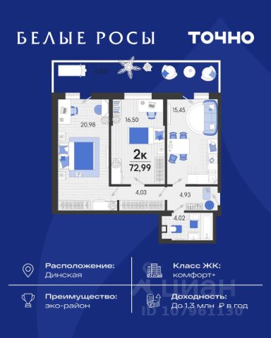 Проект включает в себя 4 корпуса в едином архитектурном стиле. Дома спроектированы в классическом европейском стиле с использованием светло-бежевого кирпича в облицовке фасадов. Входные группы каждого дома оборудованы остекленными дверьми витражного типа с чиповыми замками и домофоном. На всей территории комплекса разработана безбарьерная среда. Также все подъезды оборудованы автоматическими подъемниками для людей с ограниченными возможностями. В ЖК предложено множество планировочных решений: в наличии квартиры, как классического типа, так и европланировки. Они сдаются с подчистовой отделкой и высотой потолков 2,75 - 3 метра. На территории комплекса находится детский сад. На первых этажах корпусов предусмотрены коммерческие помещения. Дворы благоустроены: организованы прогулочные аллеи, свободные от машин, установлены детские и спортивные площадки. ЖК возводится в станице Динская. На маршрутке или автобусе можно быстро добраться в центр станицы или в Краснодар. Дорога до центральной части Динской займет около 10 минут, там можно провести время в кинотеатре или торговом центре, купить продукты на фермерском рынке, погулять с ребенком в детском парке.