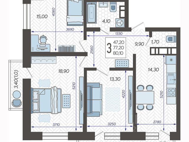 Семейная планировка: 2 изолированные комнаты + кухня-гостиная 14 м²