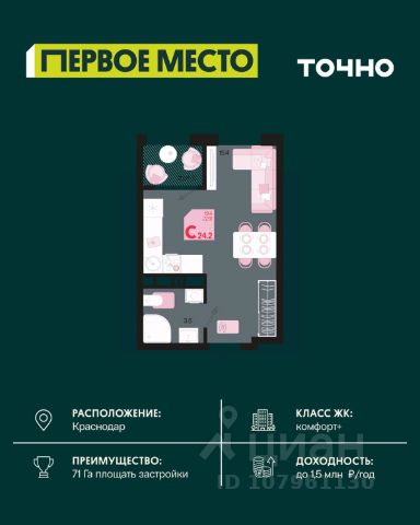 САМАЯ ДЕШЕВАЯ ЦЕНА ЗА М2 В КОМПЛЕКСЕ КОТОРЫЙ ЗДАЕТСЯ В 3-М КВАРТАЛЕ 2026 ГОДА. Продается уютная однокомнатная квартира площадью 36.8 кв. м на 5 этаже 19-этажного монолитно-кирпичного дома. Высокие потолки (3 метра) добавляют пространства и света. Окна выходят как на улицу, так и во двор, что создает приятное сочетание видов и обеспечивает отличное освещение в течение всего дня. Будет сдана Третий квартал 2026 Застройщик ТОЧНО ЖК Первое место Переуступка по договору долевого участия Жилой район "Первое место" — один из самых масштабных проектов в России площадью 71 га расположен в восточной части Краснодара. Комплекс включет 18 кварталов, состоящих из 31 дома переменной этажности от 8 до 18 этажей, собственный парк 9 га, храмовый комплекс, пешеходный бульвар "Круг семьи", детские и спортивные площадки, мангальные зоны и различные локации для отдыха. В шаговой доступности действующие муниципальные образовательные учреждения: школа на 1 100 мест и детский сад на 250 мест. Помимо этого, в жилом районе "Первое место" появится еще одна соврменная школа на 1700 мест с крытым 25-метровым бассейном и 5 детских садов на 1 490 мест. На первых этажах многоуровневых парковок "паркхабов" разместится более 61 тыс м2 коммерческих помещений. Жителям будут доступны собственный фитнес-центр, кафе, рестораны, магазины и сервисные услуги. В каждом подъезде предусмотрены дизайнерские холлы в стиле лобби отелей, консьерж-сервис, лапомойки, отдельные колясочные и велосипедные. Также в домах будут просторные кладовые помещения и комнаты для хранения почты с почтоматами для получения посылок из маркетплейсов. "Первое место" — проект для жизни или инвестиций с доходом до 1,5 млн. руб. в год.*