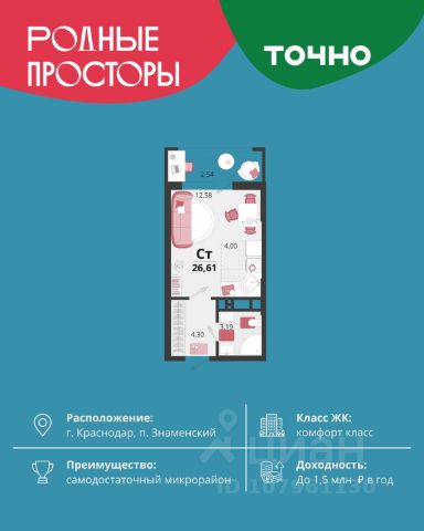 Продается квартира-студия в Жилом комплексе "Родные просторы"! В квартире выполнена качественная предчистовая отделка: Выровненные и подготовленные для отделки финишными материалами стены — улучшенная штукатурка стен. Подготовленный к укладке покрытия пол — стяжка пола. Коммуникации, выведенные в специальных местах в санузлах и кухонной зоне. Металлические входные двери с внутренней фрезеровкой и 2 замками. Металлопластиковые окна с долговечной фурнитурой. Радиаторы со встроенными терморегуляторами. Гидроизоляция пола санузлов. Крутая комплексная застройка территории с развитой инфраструктурой - на территории комплекса расположены школа на 1550 мест, 3 детских сада на 800 мест, поликлиника и частные клиники. На первых этажах домов расположены коммерческие помещения. Дворы свободны от автомобилей. Для автовладельцев предусмотрено более 2000 мест на открытых парковках по периметру микрорайона, и многоуровневые крытые наземные паркинги. Большая часть микрорайона оборудована пешеходными зонами и благоустроенными придомовыми территориями со спортивными площадками и большими детскими игровыми пространствами. Вся инфраструктура района находится в пешей доступности и располагаться внутри микрорайона. Рядом трасса М-4 - удобный выезд в сторону моря! Звоните прямо сейчас и покупайте квартиру в классном жилом комплексе!