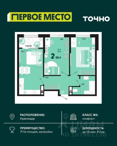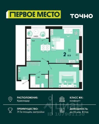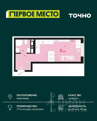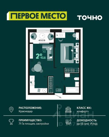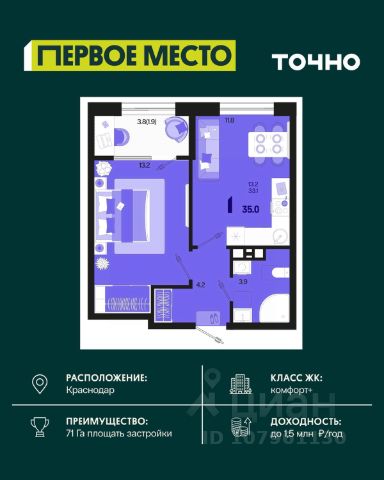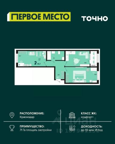 Жилой комплекс "Первое место" — современный проект, возведенный по технологии монолитного строительства с фасадами, облицованными штукатуркой с подсветкой в ночное время. Дома квартала имеют переменную этажность, что позволяет сформировать разнообразную архитектурную среду. В здании имеются пассажирский и грузовой лифты, дизайнерские холлы с зонами отдыха, колясочные и кладовые для хранения сезонных вещей. В проекте представлено множество планировочных решений — от студий до просторных 4х-комнатных квартир как в классических, так и в европланировках, в том числе имеющие мастер-спальни, ниши для шкафов и стиральных машин, встроенные лоджии с панорамным остеклением. Лоты сдаются с черновой и чистовой отделкой, высотой потолков до 3 метров и увеличенными окнами. Территория комплекса благоустроена: имеется двор с ландшафтным дизайном, места для активного времяпрепровождения и отдыха, зоны выгула собак. Развита социальная инфраструктура внутри комплекса — имеются школы, детские сады, медицинские и спортивные учреждения. Для автовладельцев предусмотрен подземный паркинг. Жилой комплекс "Первое место" располагается в новом районе города — Новознаменском, в Карасунском округе северо-восточной части Краснодара, и имеет выезд на трассы М4 "ДОН" и "Джубга-Сочи" в направлении Черного моря и горнолыжных курортов. В пешей доступности находятся продовольственные магазины, торговые центры, медицинские и образовательные учреждения, кафе и рестораны. До цента краснодара — 30 минут.
