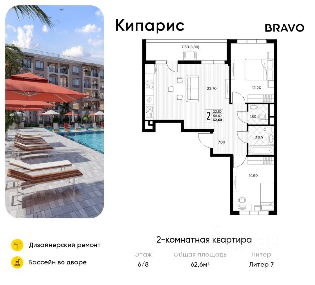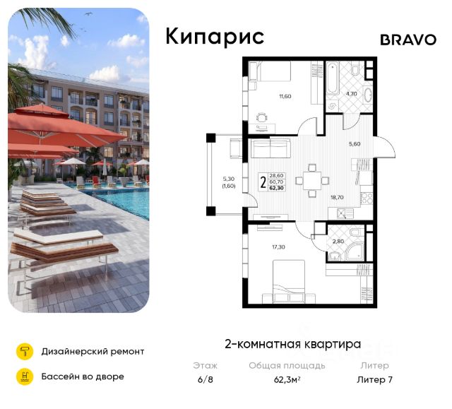 Продается 2-комнатная квартира площадью 62.60 кв. м без отделки, расположенная на 6 этаже, в новом жилом комплексе комфорт-класса "Кипарис". Прекрасный район, окруженный реликтовыми лесами и живописным рельефом гор. Адрес жилого комплекса - муниципальный округ Анапа, село Сукко, улица Мирная, дом 13. "Кипарис" - это жилой комплекс, где проявляется страсть к жизни. Здесь собраны все условия для активного отдыха, 19 бассейнов на территории, собственная развитая социальная инфраструктура и множество квартир с вдохновляющими пейзажами на долину Сукко. Транспортная доступность • Регулярный общественный транспорт для пешеходов • 3 км до Черного моря • Кипарисовое озеро в 7 минутах езды • 12 км до Анапы • 25 км до вокзала • 34 км до аэропорта Архитектура, вдохновленная побережьем моря В состав проекта "Кипарис" вошло 7 домов высотой от 4 до 8 этажей, архитектура которых вдохновлена стилем средиземноморского возрождения. Открытые балконы дают возможность быть ближе к природе. Уникальные террасы, мастер-спальни, просторные гардеробные, лоджии и окна с красивым видом - в планировках продумана каждая мелочь, что и формирует особое ощущение комфорта. Особое внимание в комплексе уделено созданию зон для отдыха и развлечений: на территории расположено 19 бассейнов, которые обеспечивают жителям возможность наслаждаться водными процедурами в любое время, создавая атмосферу курорта прямо у вас дома. Это идеальное место для семейного досуга, где можно расслабиться, позагорать или провести время с друзьями. Бассейны также оборудованы зонами для активных игр и отдыха, что делает "Кипарис" идеальным местом для тех, кто ценит комфорт и активный образ жизни. Насыщенное благоустройство Дом в долине Сукко - это не только бескрайние морские виды, зеленые леса и горы, не только полезный морской воздух, насыщенный ароматом краснокнижного можжевельника и сосен, но и также обширное благоустройство, где резидентам каждый день доступно все необходимое для комфортного отдыха. Во дворе каждого дома находится комплекс бассейнов, уютные шезлонги с зонтиками, изолированные детские и спортивные площадки, теннисные корты, зоны для пикников и барбекю. Двор закрыт от машин: за территорией комплекса предусмотрен паркинг на 3563 машино-места. Инфраструктура • Салоны красоты, кафе, магазины, аптеки на первых этажах; • Собственные детский сад на 200 мест и школа на 1100 мест; • Яхтинг, серфинг и дайвинг в шаговой доступности; • Винодельни, заповедники и достопримечательности в ближайшем окружении. Чтобы узнать подробности, обращайтесь за консультацией по телефону.