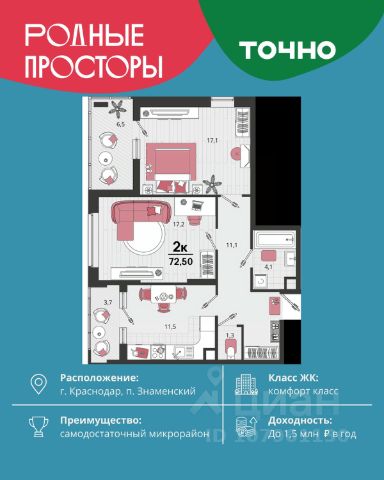Квартиры с улучшенным ремонтом из стильных современных отделочных материалов.Функциональные планировочные решения с увеличенными кухнями.Новые интересные решения в оформлении входных групп.Благоустроенные дворы, детские площадки и зоны для семейного отдыха.По утвержденному городом генеральному плану, здесь планируется строительство 2-х школ! Начало строительства первой школы на 1550 мест запланировано уже в 2021 году.Запроектированы 4 детских сада.Недалеко от комплекса планируется возведение крупного торгового комплекса.Предполагается коммерческая, социальная и транспортная инфраструктура.Близость к вашему дому лучшей парковой зоны не только Краснодара, но и России современного шикарного парка Краснодар, площадью 22,7 га.Восточный (Восточно-Кругликовский) самый популярный и при этом крупнейший район новостроек г. Краснодара. Здесь высока развита инженерная, социальная и торговая инфраструктура. Школы, детские сады, гипермаркеты, торговый центр и рынки, банки, фитнес-клубы, стадион, детская спортивная школа, парк ФК "Краснодар" и многое другое. Одним словом, у вас под рукой будет все, что необходимо современному человеку для решения не только бытовых потребностей, но и качественного образования детей, занятий спортом и семейного отдыха.
