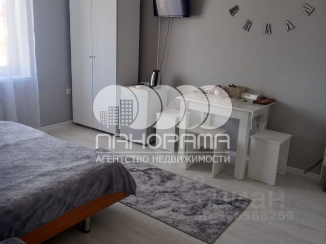 Просторное спальное место, уютная зона отдыха-рабочий стол, пуфик, шкаф для одежды, телевизор. Кухня-ниша, чайник, холодильник, микроволновая печь. Набор посуды на 2 персоны: десертные тарелки, плоские тарелки 28 см, суповые тарелки, столовые приборы, чайные пары, нож, вилки, ложки, разделочная доска, шкаф зеркало, полотенцесушитель (все останется в подарок реальному покупателю). Совмещенный с/у. Балкон с красивым видом), кондиционер и Wi-Fi.