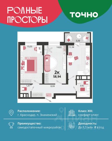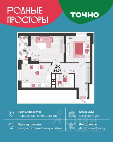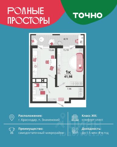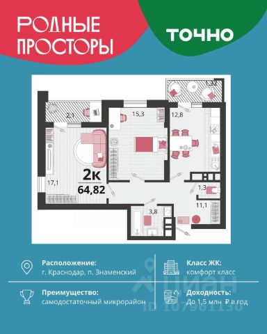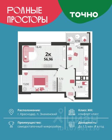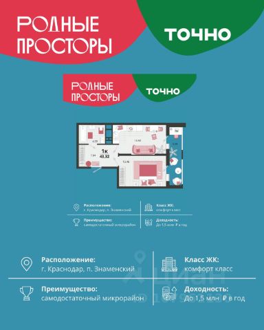 "Родные просторы"- самодостаточный микрорайон, который реализован по принципу комплексного развития территории, где есть вся инфраструктура для комфортной жизни. На территории 41 га 29 домов от 9 до 24 этажей, уютные дворы со спортивными и игровыми площадками, социальные и коммерческие объекты, зеленые массивы и фонтаны. Главная точка притяжения "Родных просторов" - парк семейного отдыха площадью 9 га, 4,5 км прогулочных аллей, амфитеатр для мероприятий, кинофестивальная площадка. Особая гордость микрорайона современная школа на 1550 мест и 3 детских сада "Ладушки", "Веснушки" и "Топотушки" на 880 малышей. В центре микрорайона строятся фитнес-клуб BALANCE с акватермальным комплексом и собственная поликлиника, площадью более 5000 кв.м. Уже открыт православный храм Святых Первоверховных апостолов Петра и Павла.
