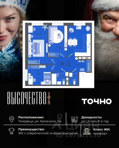 Квартира находится в перспективном, развивающемся районе Тихорецка - теплого южного города. Вокруг очень много зелени и чистый воздух. В шаговой доступности от ЖК Тихорецк - 3 школы, 2 детских сада, магазины Магнит и Пятерочка, пункты выдачи интернет-заказов. Недалеко от дома - парк и зелёная роща. Совсем рядом расположился Ледовый Дворец - гордость Тихорецка. Все, что нужно для комфортного проживания, находится в 5 минутах от дома! До центра города можно добраться на машине или общественном транспорте за 10 минут. Кстати, остановки общественного транспорта тоже находятся в шаговой доступности.