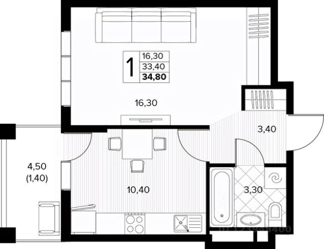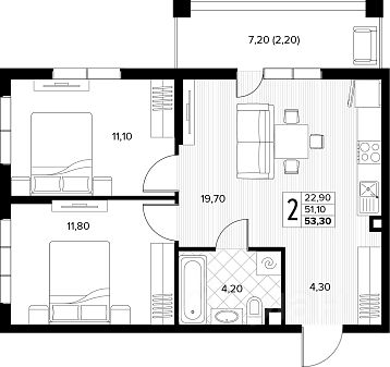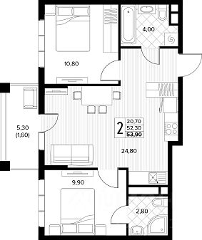 В квартире: 3 отдельные комнаты -кухня-гостиная и две спальни, комнаты на разные стороны. Прихожая с удобной встроенной мебелью и отдельной гардеробной с системой хранения.