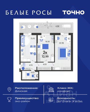Проект включает в себя 4 корпуса в едином архитектурном стиле. Дома спроектированы в классическом европейском стиле с использованием светло-бежевого кирпича в облицовке фасадов. Входные группы каждого дома оборудованы остекленными дверьми витражного типа с чиповыми замками и домофоном. На всей территории комплекса разработана безбарьерная среда. Также все подъезды оборудованы автоматическими подъемниками для людей с ограниченными возможностями. В ЖК предложено множество планировочных решений: в наличии квартиры, как классического типа, так и европланировки. Они сдаются с подчистовой отделкой и высотой потолков 2,75 - 3 метра. На территории комплекса находится детский сад. На первых этажах корпусов предусмотрены коммерческие помещения. Дворы благоустроены: организованы прогулочные аллеи, свободные от машин, установлены детские и спортивные площадки. ЖК возводится в станице Динская. На маршрутке или автобусе можно быстро добраться в центр станицы или в Краснодар. Дорога до центральной части Динской займет около 10 минут, там можно провести время в кинотеатре или торговом центре, купить продукты на фермерском рынке, погулять с ребенком в детском парке.