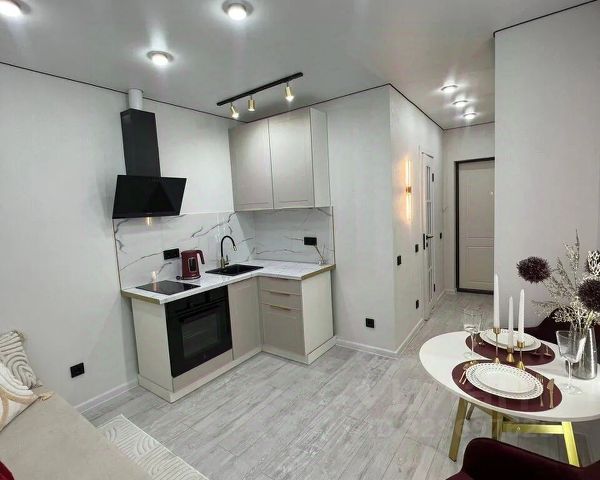 Цветовое решение дизайна: современный модерн/лофт, с более холодным практичным решением серого оттенка для кухонно-гостиной зоны, и более теплое оформление бежево-серого оттенка для спальной, что позволит комфортно чувствовать себя как мужчине, так и женщине, ценящим комфортное зонирование и уютное уединение.