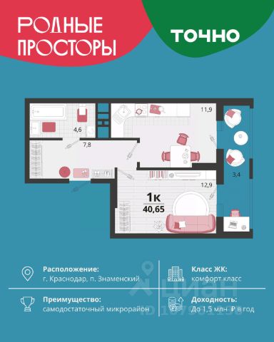 Продается квартира-студия в Жилом комплексе "Родные просторы"! В квартире выполнена качественная предчистовая отделка: Выровненные и подготовленные для отделки финишными материалами стены — улучшенная штукатурка стен. Подготовленный к укладке покрытия пол — стяжка пола. Коммуникации, выведенные в специальных местах в санузлах и кухонной зоне. Металлические входные двери с внутренней фрезеровкой и 2 замками. Металлопластиковые окна с долговечной фурнитурой. Радиаторы со встроенными терморегуляторами. Гидроизоляция пола санузлов. Крутая комплексная застройка территории с развитой инфраструктурой - на территории комплекса расположены школа на 1550 мест, 3 детских сада на 800 мест, поликлиника и частные клиники. На первых этажах домов расположены коммерческие помещения. Дворы свободны от автомобилей. Для автовладельцев предусмотрено более 2000 мест на открытых парковках по периметру микрорайона, и многоуровневые крытые наземные паркинги. Большая часть микрорайона оборудована пешеходными зонами и благоустроенными придомовыми территориями со спортивными площадками и большими детскими игровыми пространствами. Вся инфраструктура района находится в пешей доступности и располагаться внутри микрорайона. Рядом трасса М-4 - удобный выезд в сторону моря! Звоните прямо сейчас и покупайте квартиру в классном жилом комплексе!
