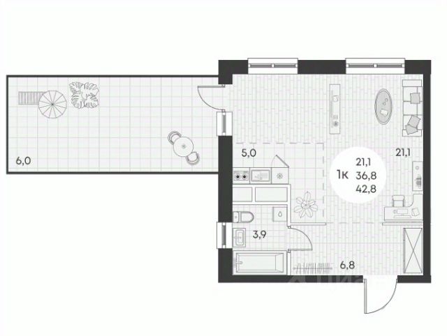 • Санузел под ключ: ванна с декоративным экраном, удобная раковина с пьедесталом, смесители, полотенцесушитель. На полу керамогранит.