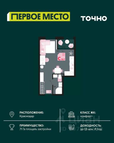 В продаже Студия от застройщика DOGMA! ЖК REEDS, г. Краснодар, Литер 4 Срок сдачи: (4 кв. 2028, общей площадью 25.2 кв.м., на 4 этаже.) ЖК REEDS это закрытый квартал, где энергия мегаполиса встречается с умиротворяющей атмосферой воды и зелени. Ваше личное пространство для лучшей жизни. Архитектура как искусство Современная классика: строгие линии, лаконичные силуэты и мягкая подсветка фасадов Эстетика в деталях: продуманный дизайн для ценителей стиля и гармонии Баланс зелени и камня: единство архитектуры и природы Благоустройство для вдохновения Зеленый бульвар: тенистые аллеи, уютные зоны отдыха и атмосфера уединения Благоустроенная набережная: пространство для гармонии и безмятежных прогулок Закрытая территория без машин: приватность и безопасность Премиальная инфраструктура Стильное лобби: просторный вестибюль с панорамными окнами, терракотовые лифтовые порталы и лаунж-зоны Ритейл на первых этажах: бутики, гастрономические магазины, салоны красоты и фитнес-студии Все для жизни: от магазинов и ресторанов до творческих и образовательных студий Умные технологии Безопасность: видеонаблюдение 24/7, контроль доступа с BLE и Face-ID Комфорт: IP-домофония, умный дом и закрытая территория Инновации: передовые IT-решения для современного образа жизни Наслаждайтесь каждым днем в атмосфере гармонии и уюта! Продается квартира-студия до 4,6 млн. рублей в Краснодарском крае.