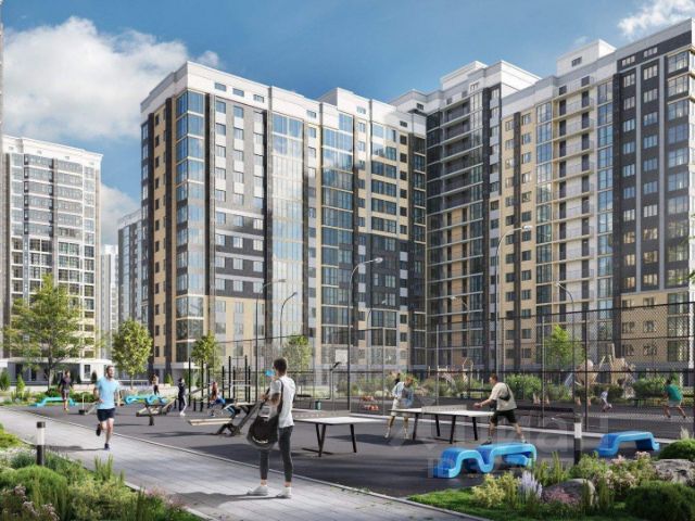 Уютный двор с дизайнерским озеленением, рулонные газоны, клумбы с автополивом, современные детские и спортивные площадки с безопасным покрытием и много свободного пространства благодаря широкой посадке домов.