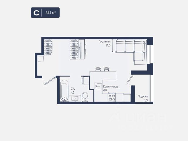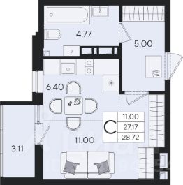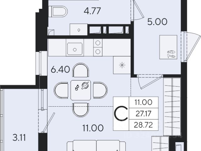 Квартира площадью 24,5 кв.м расположена на 22 этаже и имеет прекрасные видовые характеристики (вид на город, окна выходят на прогулочную зону и сквер)