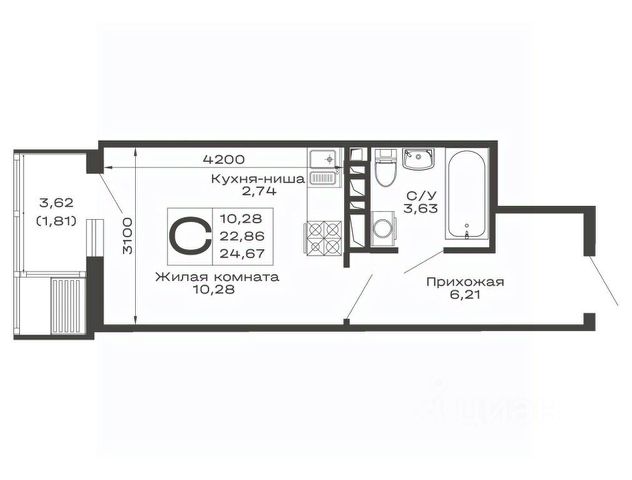 • Санузел под ключ: ванна с декоративным экраном, удобная раковина, смесители, полотенцесушитель. На полу керамогранит.