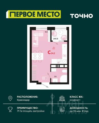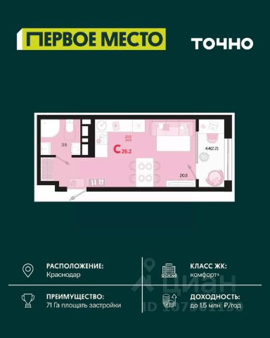 Продается квартира-студия в Жилом комплексе "Родные просторы"! В квартире выполнена качественная предчистовая отделка: Выровненные и подготовленные для отделки финишными материалами стены — улучшенная штукатурка стен. Подготовленный к укладке покрытия пол — стяжка пола. Коммуникации, выведенные в специальных местах в санузлах и кухонной зоне. Металлические входные двери с внутренней фрезеровкой и 2 замками. Металлопластиковые окна с долговечной фурнитурой. Радиаторы со встроенными терморегуляторами. Гидроизоляция пола санузлов. Крутая комплексная застройка территории с развитой инфраструктурой - на территории комплекса расположены школа на 1550 мест, 3 детских сада на 800 мест, поликлиника и частные клиники. На первых этажах домов расположены коммерческие помещения. Дворы свободны от автомобилей. Для автовладельцев предусмотрено более 2000 мест на открытых парковках по периметру микрорайона, и многоуровневые крытые наземные паркинги. Большая часть микрорайона оборудована пешеходными зонами и благоустроенными придомовыми территориями со спортивными площадками и большими детскими игровыми пространствами. Вся инфраструктура района находится в пешей доступности и располагаться внутри микрорайона. Рядом трасса М-4 - удобный выезд в сторону моря! Звоните прямо сейчас и покупайте квартиру в классном жилом комплексе!