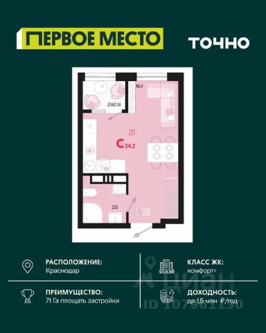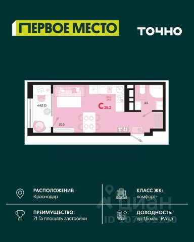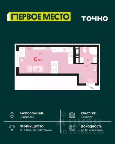 Жилой комплекс "Первое место" — современный проект, возведенный по технологии монолитного строительства с фасадами, облицованными штукатуркой с подсветкой в ночное время. Дома квартала имеют переменную этажность, что позволяет сформировать разнообразную архитектурную среду. В здании имеются пассажирский и грузовой лифты, дизайнерские холлы с зонами отдыха, колясочные и кладовые для хранения сезонных вещей. В проекте представлено множество планировочных решений — от студий до просторных 4х-комнатных квартир как в классических, так и в европланировках, в том числе имеющие мастер-спальни, ниши для шкафов и стиральных машин, встроенные лоджии с панорамным остеклением. Лоты сдаются с черновой и чистовой отделкой, высотой потолков до 3 метров и увеличенными окнами. Территория комплекса благоустроена: имеется двор с ландшафтным дизайном, места для активного времяпрепровождения и отдыха, зоны выгула собак. Развита социальная инфраструктура внутри комплекса — имеются школы, детские сады, медицинские и спортивные учреждения. Для автовладельцев предусмотрен подземный паркинг. Жилой комплекс "Первое место" располагается в новом районе города — Новознаменском, в Карасунском округе северо-восточной части Краснодара, и имеет выезд на трассы М4 "ДОН" и "Джубга-Сочи" в направлении Черного моря и горнолыжных курортов. В пешей доступности находятся продовольственные магазины, торговые центры, медицинские и образовательные учреждения, кафе и рестораны. До цента краснодара — 30 минут.