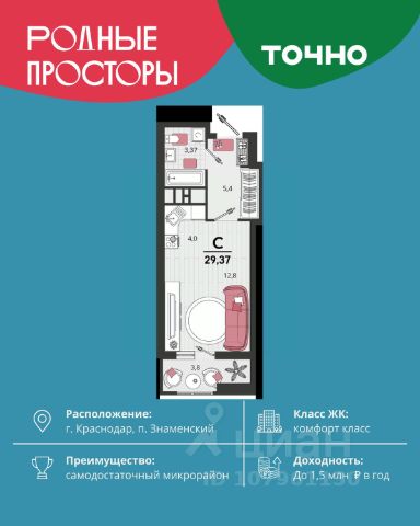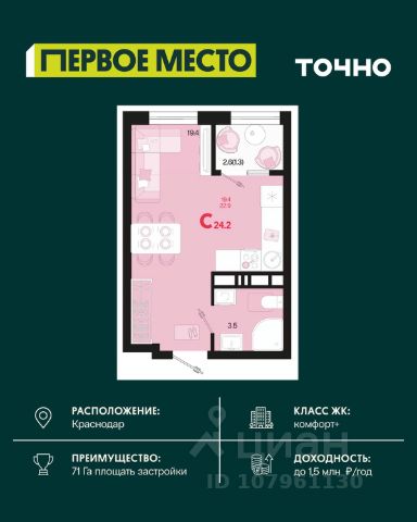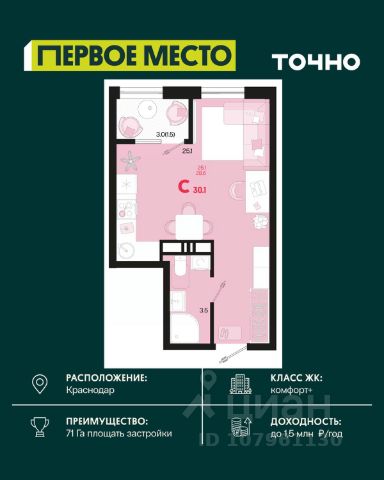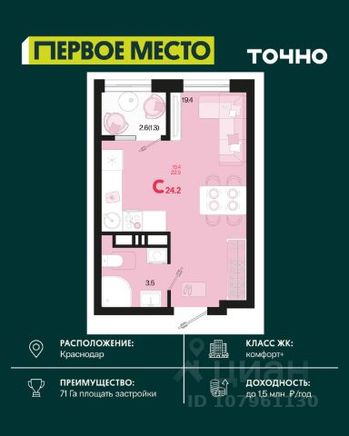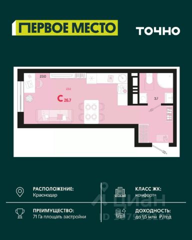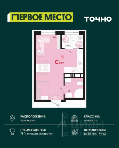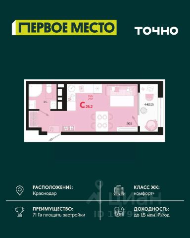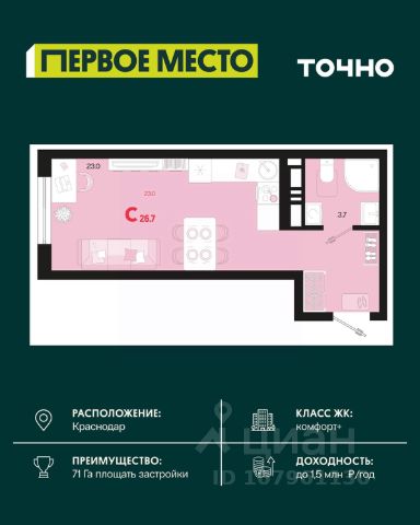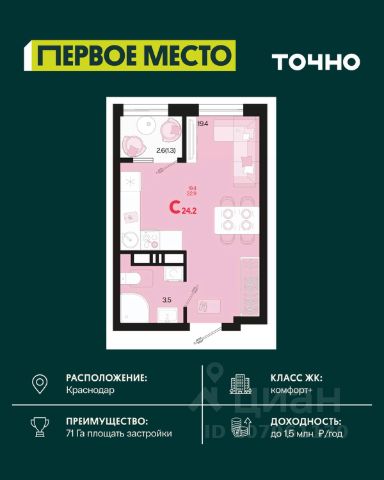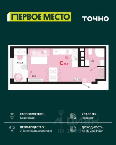 Жилой комплекс "Первое место" — современный проект, возведенный по технологии монолитного строительства с фасадами, облицованными штукатуркой с подсветкой в ночное время. Дома квартала имеют переменную этажность, что позволяет сформировать разнообразную архитектурную среду. В здании имеются пассажирский и грузовой лифты, дизайнерские холлы с зонами отдыха, колясочные и кладовые для хранения сезонных вещей. В проекте представлено множество планировочных решений — от студий до просторных 4х-комнатных квартир как в классических, так и в европланировках, в том числе имеющие мастер-спальни, ниши для шкафов и стиральных машин, встроенные лоджии с панорамным остеклением. Лоты сдаются с черновой и чистовой отделкой, высотой потолков до 3 метров и увеличенными окнами. Территория комплекса благоустроена: имеется двор с ландшафтным дизайном, места для активного времяпрепровождения и отдыха, зоны выгула собак. Развита социальная инфраструктура внутри комплекса — имеются школы, детские сады, медицинские и спортивные учреждения. Для автовладельцев предусмотрен подземный паркинг. Жилой комплекс "Первое место" располагается в новом районе города — Новознаменском, в Карасунском округе северо-восточной части Краснодара, и имеет выезд на трассы М4 "ДОН" и "Джубга-Сочи" в направлении Черного моря и горнолыжных курортов. В пешей доступности находятся продовольственные магазины, торговые центры, медицинские и образовательные учреждения, кафе и рестораны. До цента краснодара — 30 минут.