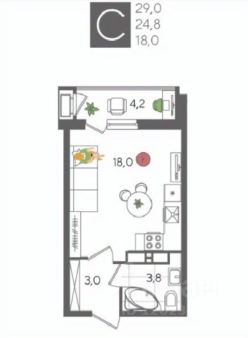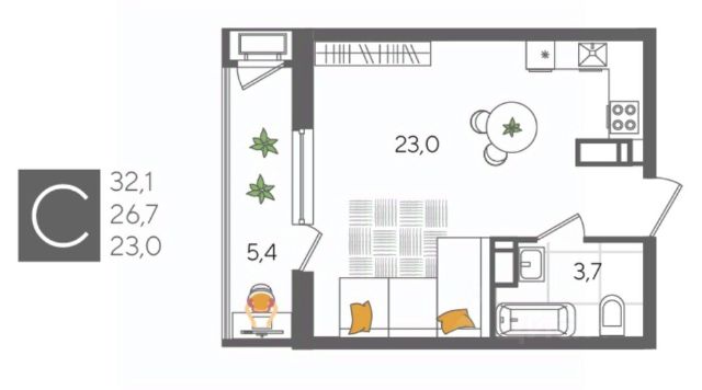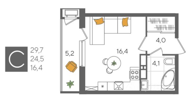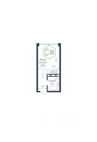 Квартира площадью 24,5 кв.м расположена на 22 этаже и имеет прекрасные видовые характеристики (вид на город, окна выходят на прогулочную зону и сквер)