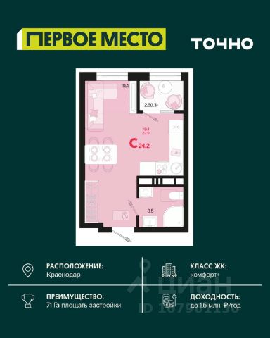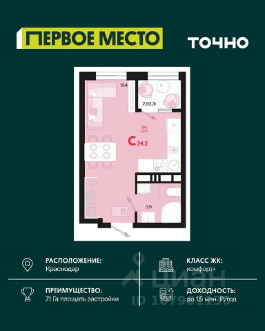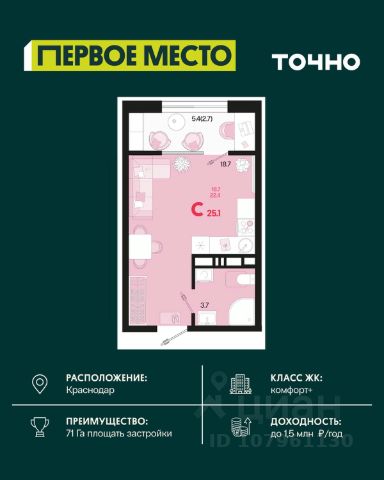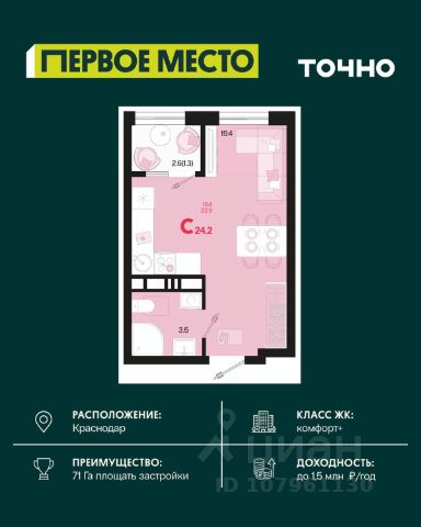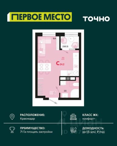 Продается квартира-студия в Жилом комплексе "Родные просторы"! В квартире выполнена качественная предчистовая отделка: Выровненные и подготовленные для отделки финишными материалами стены — улучшенная штукатурка стен. Подготовленный к укладке покрытия пол — стяжка пола. Коммуникации, выведенные в специальных местах в санузлах и кухонной зоне. Металлические входные двери с внутренней фрезеровкой и 2 замками. Металлопластиковые окна с долговечной фурнитурой. Радиаторы со встроенными терморегуляторами. Гидроизоляция пола санузлов. Крутая комплексная застройка территории с развитой инфраструктурой - на территории комплекса расположены школа на 1550 мест, 3 детских сада на 800 мест, поликлиника и частные клиники. На первых этажах домов расположены коммерческие помещения. Дворы свободны от автомобилей. Для автовладельцев предусмотрено более 2000 мест на открытых парковках по периметру микрорайона, и многоуровневые крытые наземные паркинги. Большая часть микрорайона оборудована пешеходными зонами и благоустроенными придомовыми территориями со спортивными площадками и большими детскими игровыми пространствами. Вся инфраструктура района находится в пешей доступности и располагаться внутри микрорайона. Рядом трасса М-4 - удобный выезд в сторону моря! Звоните прямо сейчас и покупайте квартиру в классном жилом комплексе!