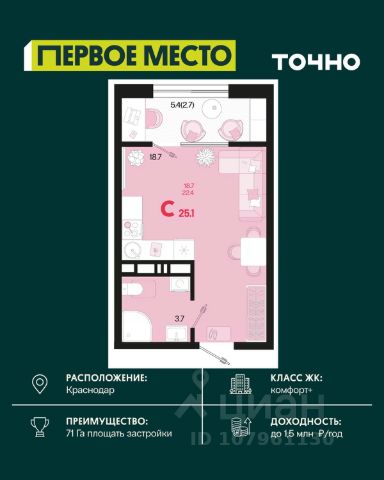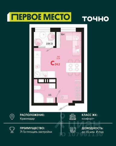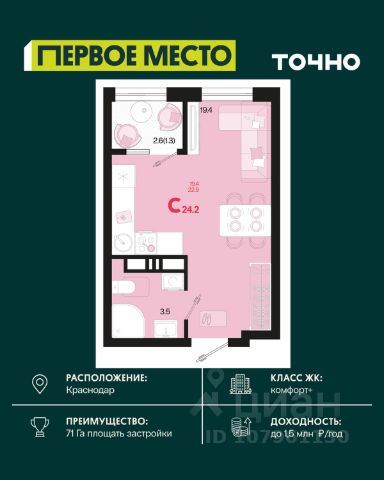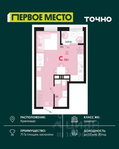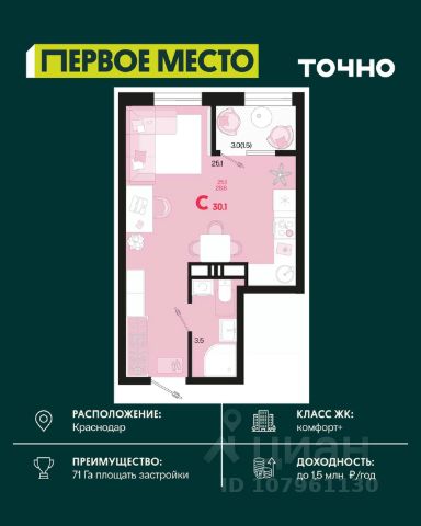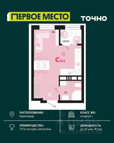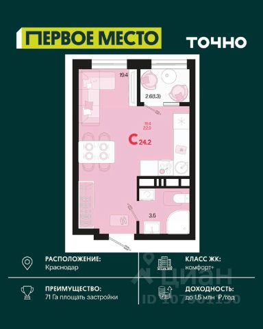 Жилой комплекс "Первое место" — современный проект, возведенный по технологии монолитного строительства с фасадами, облицованными штукатуркой с подсветкой в ночное время. Дома квартала имеют переменную этажность, что позволяет сформировать разнообразную архитектурную среду. В здании имеются пассажирский и грузовой лифты, дизайнерские холлы с зонами отдыха, колясочные и кладовые для хранения сезонных вещей. В проекте представлено множество планировочных решений — от студий до просторных 4х-комнатных квартир как в классических, так и в европланировках, в том числе имеющие мастер-спальни, ниши для шкафов и стиральных машин, встроенные лоджии с панорамным остеклением. Лоты сдаются с черновой и чистовой отделкой, высотой потолков до 3 метров и увеличенными окнами. Территория комплекса благоустроена: имеется двор с ландшафтным дизайном, места для активного времяпрепровождения и отдыха, зоны выгула собак. Развита социальная инфраструктура внутри комплекса — имеются школы, детские сады, медицинские и спортивные учреждения. Для автовладельцев предусмотрен подземный паркинг. Жилой комплекс "Первое место" располагается в новом районе города — Новознаменском, в Карасунском округе северо-восточной части Краснодара, и имеет выезд на трассы М4 "ДОН" и "Джубга-Сочи" в направлении Черного моря и горнолыжных курортов. В пешей доступности находятся продовольственные магазины, торговые центры, медицинские и образовательные учреждения, кафе и рестораны. До цента краснодара — 30 минут.