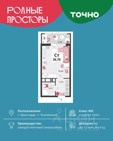 Продается квартира-студия в Жилом комплексе "Родные просторы"! В квартире выполнена качественная предчистовая отделка: Выровненные и подготовленные для отделки финишными материалами стены — улучшенная штукатурка стен. Подготовленный к укладке покрытия пол — стяжка пола. Коммуникации, выведенные в специальных местах в санузлах и кухонной зоне. Металлические входные двери с внутренней фрезеровкой и 2 замками. Металлопластиковые окна с долговечной фурнитурой. Радиаторы со встроенными терморегуляторами. Гидроизоляция пола санузлов. Крутая комплексная застройка территории с развитой инфраструктурой - на территории комплекса расположены школа на 1550 мест, 3 детских сада на 800 мест, поликлиника и частные клиники. На первых этажах домов расположены коммерческие помещения. Дворы свободны от автомобилей. Для автовладельцев предусмотрено более 2000 мест на открытых парковках по периметру микрорайона, и многоуровневые крытые наземные паркинги. Большая часть микрорайона оборудована пешеходными зонами и благоустроенными придомовыми территориями со спортивными площадками и большими детскими игровыми пространствами. Вся инфраструктура района находится в пешей доступности и располагаться внутри микрорайона. Рядом трасса М-4 - удобный выезд в сторону моря! Звоните прямо сейчас и покупайте квартиру в классном жилом комплексе!