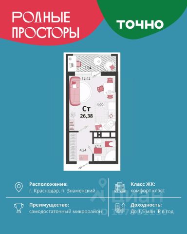 Продается квартира-студия в Жилом комплексе "Родные просторы"! В квартире выполнена качественная предчистовая отделка: Выровненные и подготовленные для отделки финишными материалами стены — улучшенная штукатурка стен. Подготовленный к укладке покрытия пол — стяжка пола. Коммуникации, выведенные в специальных местах в санузлах и кухонной зоне. Металлические входные двери с внутренней фрезеровкой и 2 замками. Металлопластиковые окна с долговечной фурнитурой. Радиаторы со встроенными терморегуляторами. Гидроизоляция пола санузлов. Крутая комплексная застройка территории с развитой инфраструктурой - на территории комплекса расположены школа на 1550 мест, 3 детских сада на 800 мест, поликлиника и частные клиники. На первых этажах домов расположены коммерческие помещения. Дворы свободны от автомобилей. Для автовладельцев предусмотрено более 2000 мест на открытых парковках по периметру микрорайона, и многоуровневые крытые наземные паркинги. Большая часть микрорайона оборудована пешеходными зонами и благоустроенными придомовыми территориями со спортивными площадками и большими детскими игровыми пространствами. Вся инфраструктура района находится в пешей доступности и располагаться внутри микрорайона. Рядом трасса М-4 - удобный выезд в сторону моря! Звоните прямо сейчас и покупайте квартиру в классном жилом комплексе!