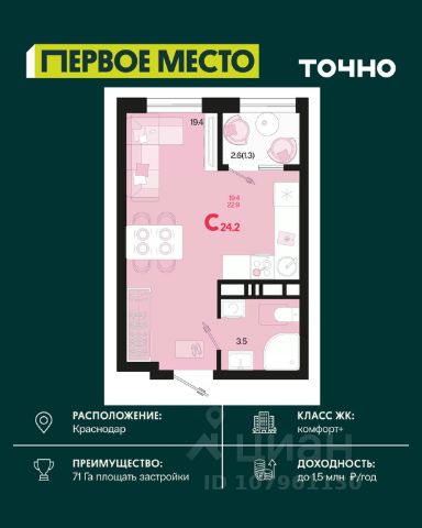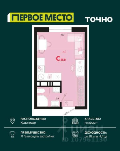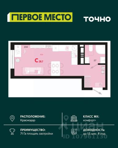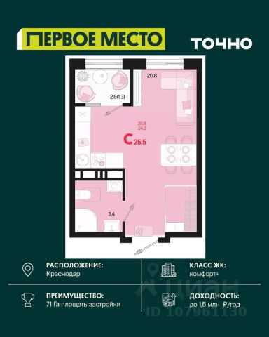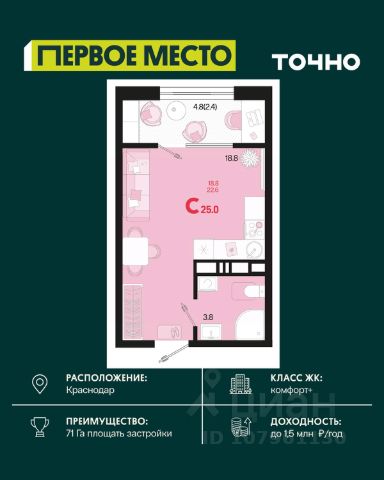 Жилой комплекс "Первое место" — современный проект, возведенный по технологии монолитного строительства с фасадами, облицованными штукатуркой с подсветкой в ночное время. Дома квартала имеют переменную этажность, что позволяет сформировать разнообразную архитектурную среду. В здании имеются пассажирский и грузовой лифты, дизайнерские холлы с зонами отдыха, колясочные и кладовые для хранения сезонных вещей. В проекте представлено множество планировочных решений — от студий до просторных 4х-комнатных квартир как в классических, так и в европланировках, в том числе имеющие мастер-спальни, ниши для шкафов и стиральных машин, встроенные лоджии с панорамным остеклением. Лоты сдаются с черновой и чистовой отделкой, высотой потолков до 3 метров и увеличенными окнами. Территория комплекса благоустроена: имеется двор с ландшафтным дизайном, места для активного времяпрепровождения и отдыха, зоны выгула собак. Развита социальная инфраструктура внутри комплекса — имеются школы, детские сады, медицинские и спортивные учреждения. Для автовладельцев предусмотрен подземный паркинг. Жилой комплекс "Первое место" располагается в новом районе города — Новознаменском, в Карасунском округе северо-восточной части Краснодара, и имеет выезд на трассы М4 "ДОН" и "Джубга-Сочи" в направлении Черного моря и горнолыжных курортов. В пешей доступности находятся продовольственные магазины, торговые центры, медицинские и образовательные учреждения, кафе и рестораны. До цента краснодара — 30 минут.