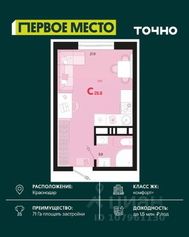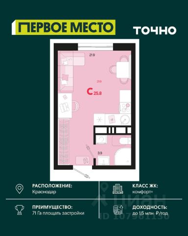Жилой комплекс "Первое место" — современный проект, возведенный по технологии монолитного строительства с фасадами, облицованными штукатуркой с подсветкой в ночное время. Дома квартала имеют переменную этажность, что позволяет сформировать разнообразную архитектурную среду. В здании имеются пассажирский и грузовой лифты, дизайнерские холлы с зонами отдыха, колясочные и кладовые для хранения сезонных вещей. В проекте представлено множество планировочных решений — от студий до просторных 4х-комнатных квартир как в классических, так и в европланировках, в том числе имеющие мастер-спальни, ниши для шкафов и стиральных машин, встроенные лоджии с панорамным остеклением. Лоты сдаются с черновой и чистовой отделкой, высотой потолков до 3 метров и увеличенными окнами. Территория комплекса благоустроена: имеется двор с ландшафтным дизайном, места для активного времяпрепровождения и отдыха, зоны выгула собак. Развита социальная инфраструктура внутри комплекса — имеются школы, детские сады, медицинские и спортивные учреждения. Для автовладельцев предусмотрен подземный паркинг. Жилой комплекс "Первое место" располагается в новом районе города — Новознаменском, в Карасунском округе северо-восточной части Краснодара, и имеет выезд на трассы М4 "ДОН" и "Джубга-Сочи" в направлении Черного моря и горнолыжных курортов. В пешей доступности находятся продовольственные магазины, торговые центры, медицинские и образовательные учреждения, кафе и рестораны. До цента краснодара — 30 минут.