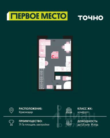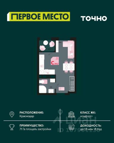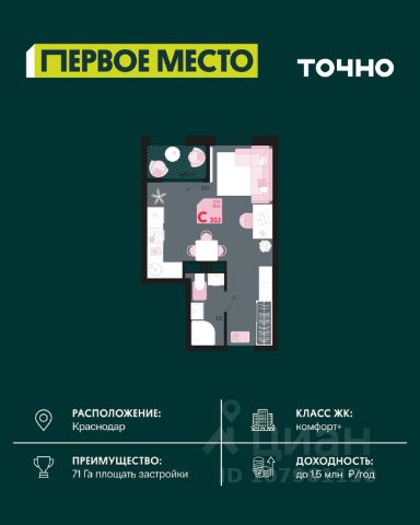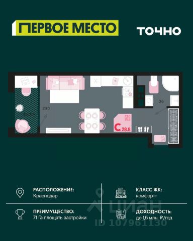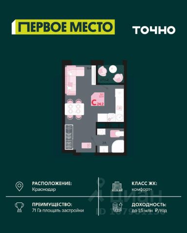 Жилой комплекс "Первое место" — современный проект, возведенный по технологии монолитного строительства с фасадами, облицованными штукатуркой с подсветкой в ночное время. Дома квартала имеют переменную этажность, что позволяет сформировать разнообразную архитектурную среду. В здании имеются пассажирский и грузовой лифты, дизайнерские холлы с зонами отдыха, колясочные и кладовые для хранения сезонных вещей. В проекте представлено множество планировочных решений — от студий до просторных 4х-комнатных квартир как в классических, так и в европланировках, в том числе имеющие мастер-спальни, ниши для шкафов и стиральных машин, встроенные лоджии с панорамным остеклением. Лоты сдаются с черновой и чистовой отделкой, высотой потолков до 3 метров и увеличенными окнами. Территория комплекса благоустроена: имеется двор с ландшафтным дизайном, места для активного времяпрепровождения и отдыха, зоны выгула собак. Развита социальная инфраструктура внутри комплекса — имеются школы, детские сады, медицинские и спортивные учреждения. Для автовладельцев предусмотрен подземный паркинг. Жилой комплекс "Первое место" располагается в новом районе города — Новознаменском, в Карасунском округе северо-восточной части Краснодара, и имеет выезд на трассы М4 "ДОН" и "Джубга-Сочи" в направлении Черного моря и горнолыжных курортов. В пешей доступности находятся продовольственные магазины, торговые центры, медицинские и образовательные учреждения, кафе и рестораны. До цента краснодара — 30 минут.