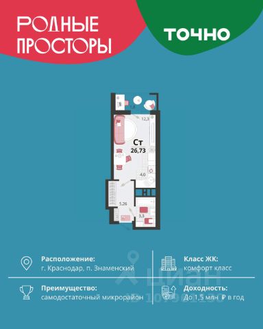 Продается квартира-студия в Жилом комплексе "Родные просторы"! В квартире выполнена качественная предчистовая отделка: Выровненные и подготовленные для отделки финишными материалами стены — улучшенная штукатурка стен. Подготовленный к укладке покрытия пол — стяжка пола. Коммуникации, выведенные в специальных местах в санузлах и кухонной зоне. Металлические входные двери с внутренней фрезеровкой и 2 замками. Металлопластиковые окна с долговечной фурнитурой. Радиаторы со встроенными терморегуляторами. Гидроизоляция пола санузлов. Крутая комплексная застройка территории с развитой инфраструктурой - на территории комплекса расположены школа на 1550 мест, 3 детских сада на 800 мест, поликлиника и частные клиники. На первых этажах домов расположены коммерческие помещения. Дворы свободны от автомобилей. Для автовладельцев предусмотрено более 2000 мест на открытых парковках по периметру микрорайона, и многоуровневые крытые наземные паркинги. Большая часть микрорайона оборудована пешеходными зонами и благоустроенными придомовыми территориями со спортивными площадками и большими детскими игровыми пространствами. Вся инфраструктура района находится в пешей доступности и располагаться внутри микрорайона. Рядом трасса М-4 - удобный выезд в сторону моря! Звоните прямо сейчас и покупайте квартиру в классном жилом комплексе!
