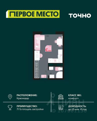 В продаже студия от застройщика! ЖК "Рекорд", г. Краснодар, Литер 4, общей площадью 30.4 кв.м., на 3 этаже. Жилой Комплекс "РЕКОРД" - место вашего баланса. Город снаружи природа внутри. Квартал с максимумом возможностей для хорошо сбалансированной жизни. Расположен в оживленном благоустроенном районе города. Сочетает в себе и жилую застройку, и торгово-деловые центры. Здесь все под рукой, здесь центр городских событий. • Уникальная локация центр города • Современная архитектура • Панорамные виды • Двухуровневые квартиры с камином и террасой • Элегантные входные группы • Архитектурная подсветка фасадов • Школа во дворе (1550 мест) • Детский сад во дворе (110 мест) • Двор без машин • Подземный паркинг и гостевые парковки • Круглосуточный пост охраны • Медицинский центр • Фитнес центр • Система "умный дом" • Баскетбольная и универсальная спортивные площадки • Современные развивающие детские игровые площадки • Ресторанный дворик с аллеей и фонтаном • Храм с уникальной архитектурой • Премиальные лифты с подсветкой и музыкой • Звукоизоляционные окна • Зарядные устройства для электромобилей • Ароматизация мест общего пользования • Элегантные входные группы • Дизайнерские лобби • Консьерж сервис • Сквозные подъезды и доступ по Face ID • Кладовки • Кондиционирование холлов • Благоустройство территории с Арт объектом • Воркаут-зоны • Зона коворкинга • Wi-fi и USB розетки на всей территории двора Приобрести квартиру можно одним из способов: -субсидированная семейная ипотека 4,5 % на весь срок -рассрочка до конца строительства -оплата наличными -дистанционная покупка Позвоните сейчас и забронируйте квартиру со скидкой! Купить квартиру-студию в округе Карасунский в городе Краснодар.