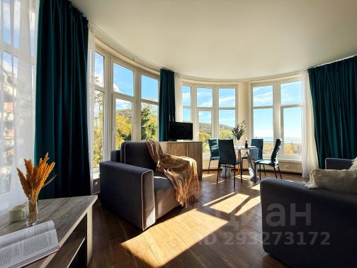 В апартаментах есть всё необходимое для комфортного проживания и отдыха: двуспальная кровать, прикроватные тумбочки, диван, кресло, шкаф, стол и стулья, телевизор, чайник, микроволновая печь, холодильник, зеркало, совмещенный санузел. Благодаря удачному расположению окон, помещение всегда наполнено естественным светом, шикарный вид на море и горы, это создаёт особую атмосферу.