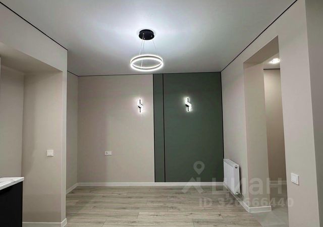 На полу ламинат, установлены межкомнатные двери, натяжные потолки с точечными светильниками, в санузле керамогранит, сантехника, на стенах обои, покраска и декоративная штукатурка