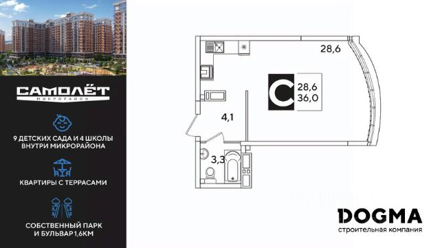 DOGMA - ТОП-3 застройщик по объему строительства в РФ. "САМОЛЁТ" — концептуальный жилой микрорайон, который расположен на северо-западе Краснодара, в районе Западного Обхода. Квартал спроектирован как "город в городе", поэтому здесь будет всё для комфортной жизни: современные дома с разными планировками, дороги, школы и детские сады, поликлиника, торговые центры, парки и аллеи. Микрорайон находится далеко от промышленных предприятий, сочетает удобство городской жизни и экологически благоприятную среду. Инфраструктура нового микрорайона: • 4 школы и 9 детских садов на территории микрорайона • Функциональные планировки • Собственный бульвар протяжённостью 1,6км • Светомузыкальный фонтан протяжённостью 55 метров • Амфитеатр • Парк 7 ГА • Скейт-парк • Детская аква-площадка • Круглосуточное видеонаблюдение и пост охраны Приобрести квартиру можно одним из способов: ипотека, рассрочка, наличный расчет.