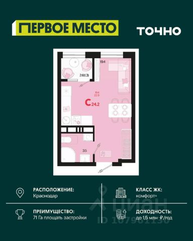 Жилой комплекс "Первое место" — современный проект, возведенный по технологии монолитного строительства с фасадами, облицованными штукатуркой с подсветкой в ночное время. Дома квартала имеют переменную этажность, что позволяет сформировать разнообразную архитектурную среду. В здании имеются пассажирский и грузовой лифты, дизайнерские холлы с зонами отдыха, колясочные и кладовые для хранения сезонных вещей. В проекте представлено множество планировочных решений — от студий до просторных 4х-комнатных квартир как в классических, так и в европланировках, в том числе имеющие мастер-спальни, ниши для шкафов и стиральных машин, встроенные лоджии с панорамным остеклением. Лоты сдаются с черновой и чистовой отделкой, высотой потолков до 3 метров и увеличенными окнами. Территория комплекса благоустроена: имеется двор с ландшафтным дизайном, места для активного времяпрепровождения и отдыха, зоны выгула собак. Развита социальная инфраструктура внутри комплекса — имеются школы, детские сады, медицинские и спортивные учреждения. Для автовладельцев предусмотрен подземный паркинг. Жилой комплекс "Первое место" располагается в новом районе города — Новознаменском, в Карасунском округе северо-восточной части Краснодара, и имеет выезд на трассы М4 "ДОН" и "Джубга-Сочи" в направлении Черного моря и горнолыжных курортов. В пешей доступности находятся продовольственные магазины, торговые центры, медицинские и образовательные учреждения, кафе и рестораны. До цента краснодара — 30 минут.