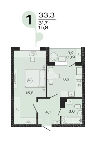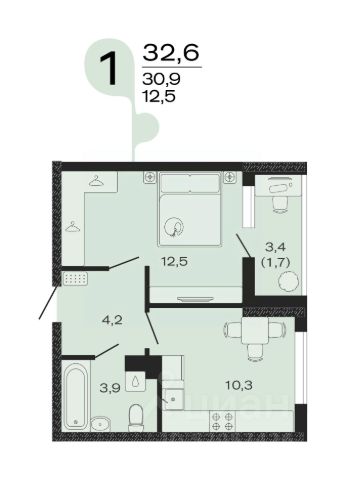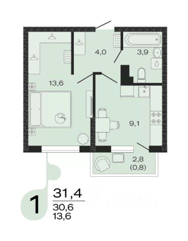 Продаётся 1-комнатная квартира в строящемся доме (Литер 3), срок сдачи: IV-кв. 2027, общей площадью 31.4 кв.м., на 2 этаже.