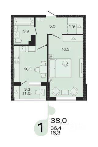 Продаётся 1-комнатная квартира в строящемся доме (Литер 3), срок сдачи: IV-кв. 2027, общей площадью 38 кв.м., на 3 этаже.