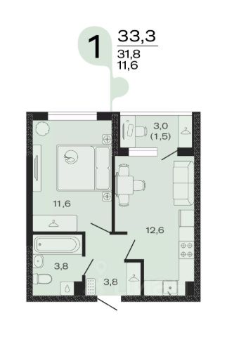 Продаётся 1-комнатная квартира в строящемся доме (Литер 3), срок сдачи: IV-кв. 2027, общей площадью 33.3 кв.м., на 4 этаже.