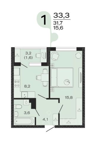 Продаётся 1-комнатная квартира в строящемся доме (Литер 3), срок сдачи: IV-кв. 2027, общей площадью 33.3 кв.м., на 2 этаже.