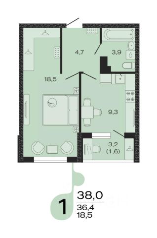 Продаётся 1-комнатная квартира в строящемся доме (Литер 3), срок сдачи: IV-кв. 2027, общей площадью 38 кв.м., на 1 этаже.